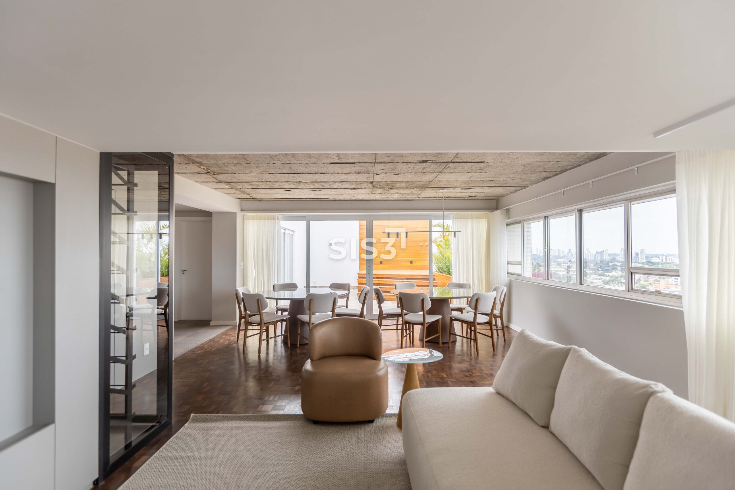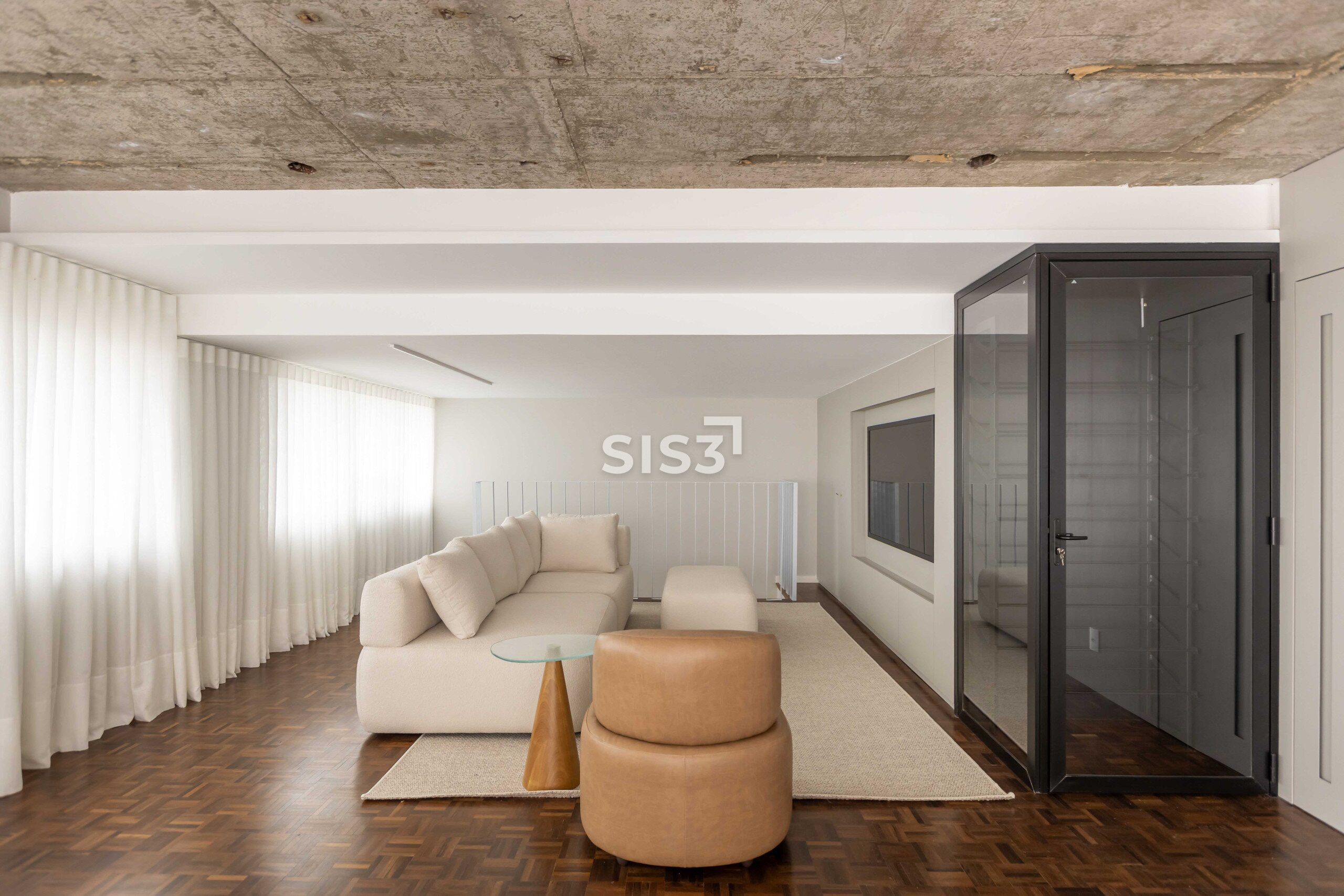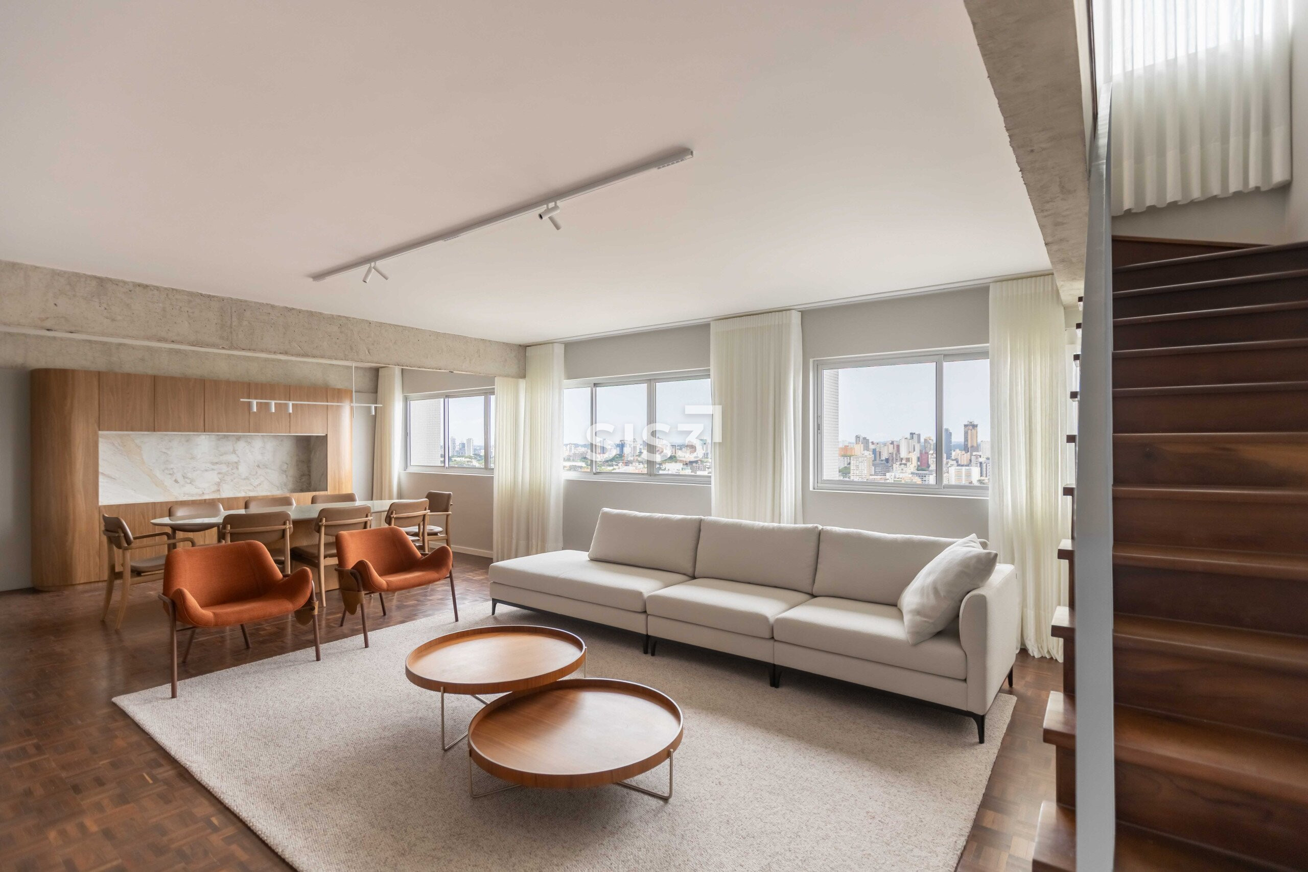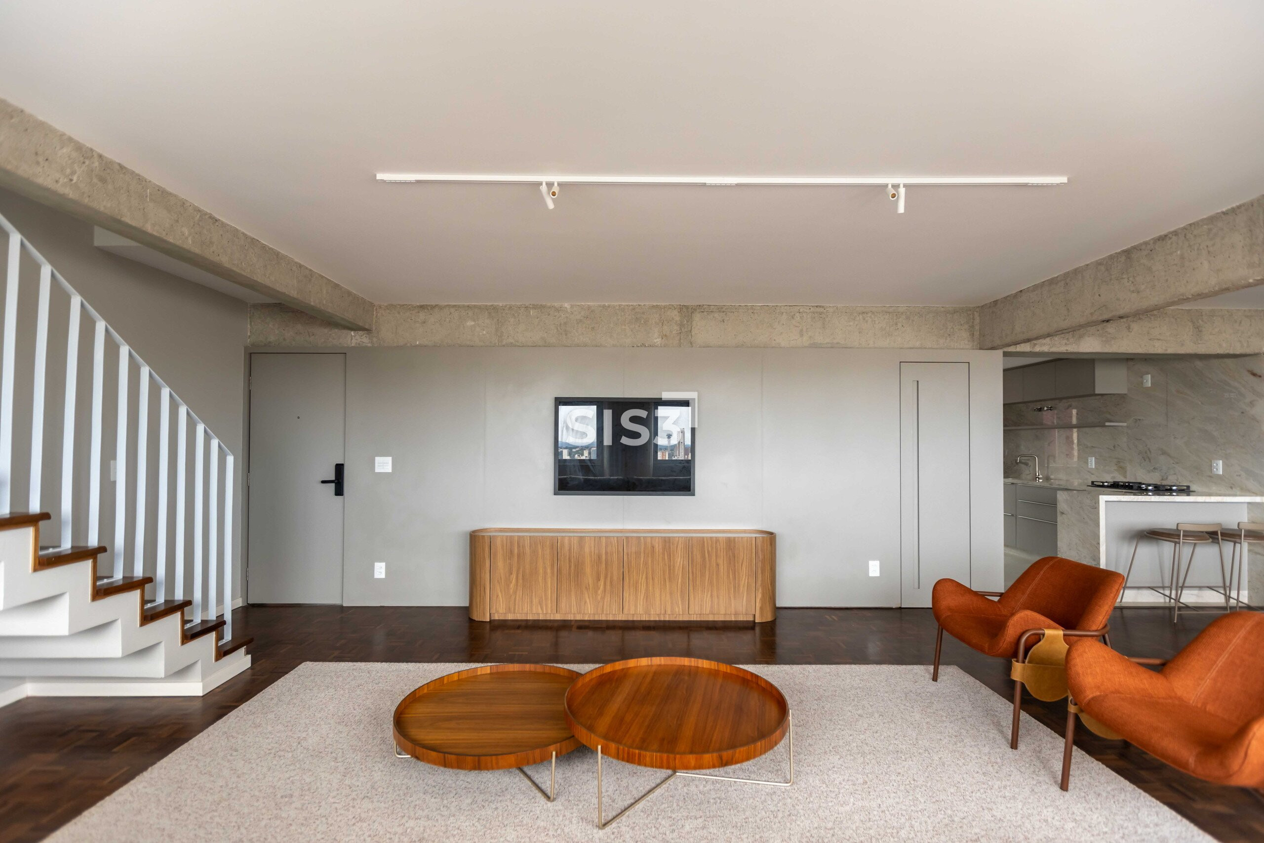O Edifício Concorde passa por um retrofit completo que atualiza sua estrutura e seus espaços, respeitando a arquitetura original e revelando novos elementos construtivos. Nesta cobertura duplex de 360 m² privativos, a intervenção valoriza a laje aparente, os volumes estruturais expostos e a combinação precisa entre concreto, madeira e superfícies claras, criando uma leitura contemporânea e atemporal.