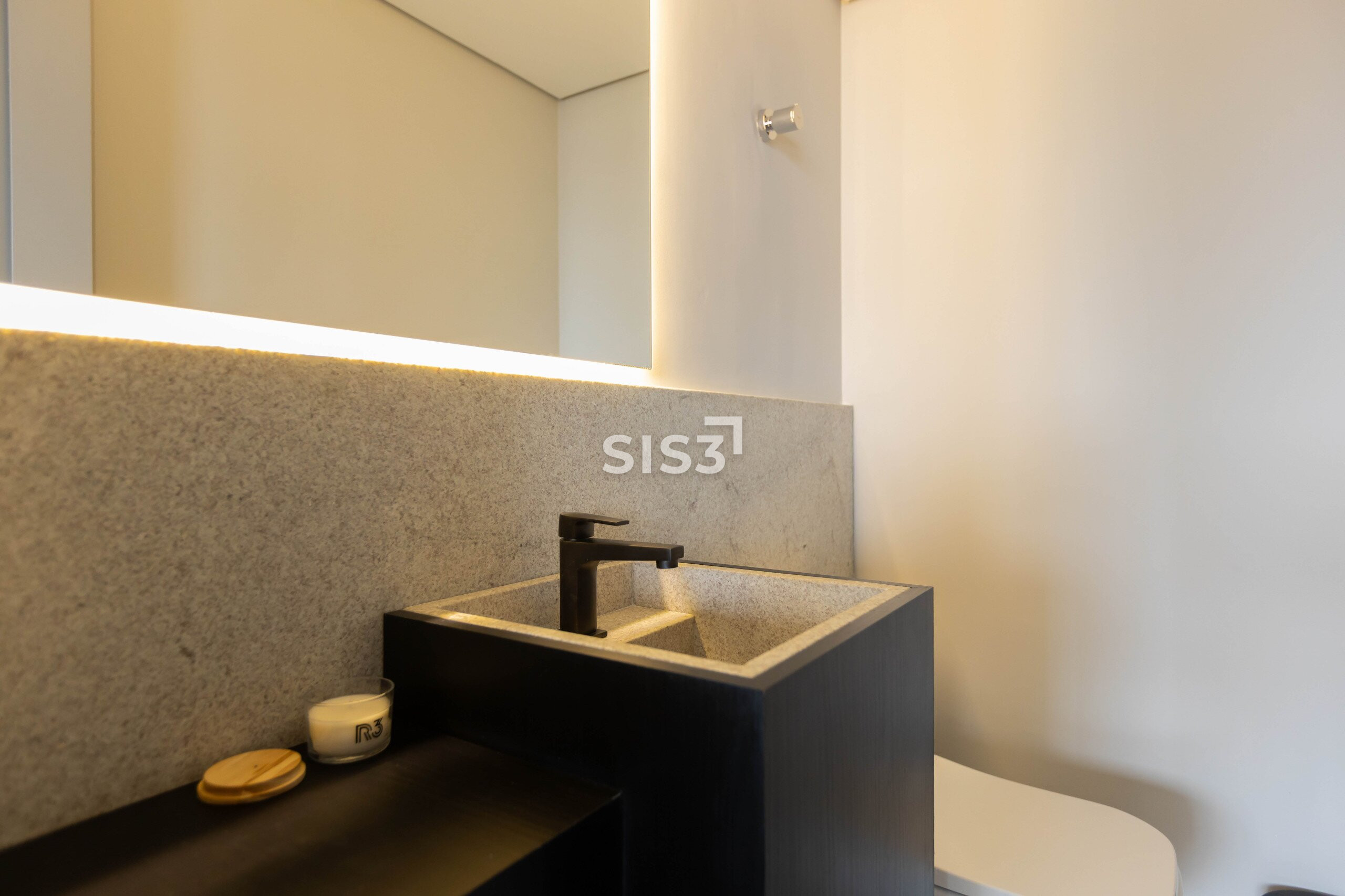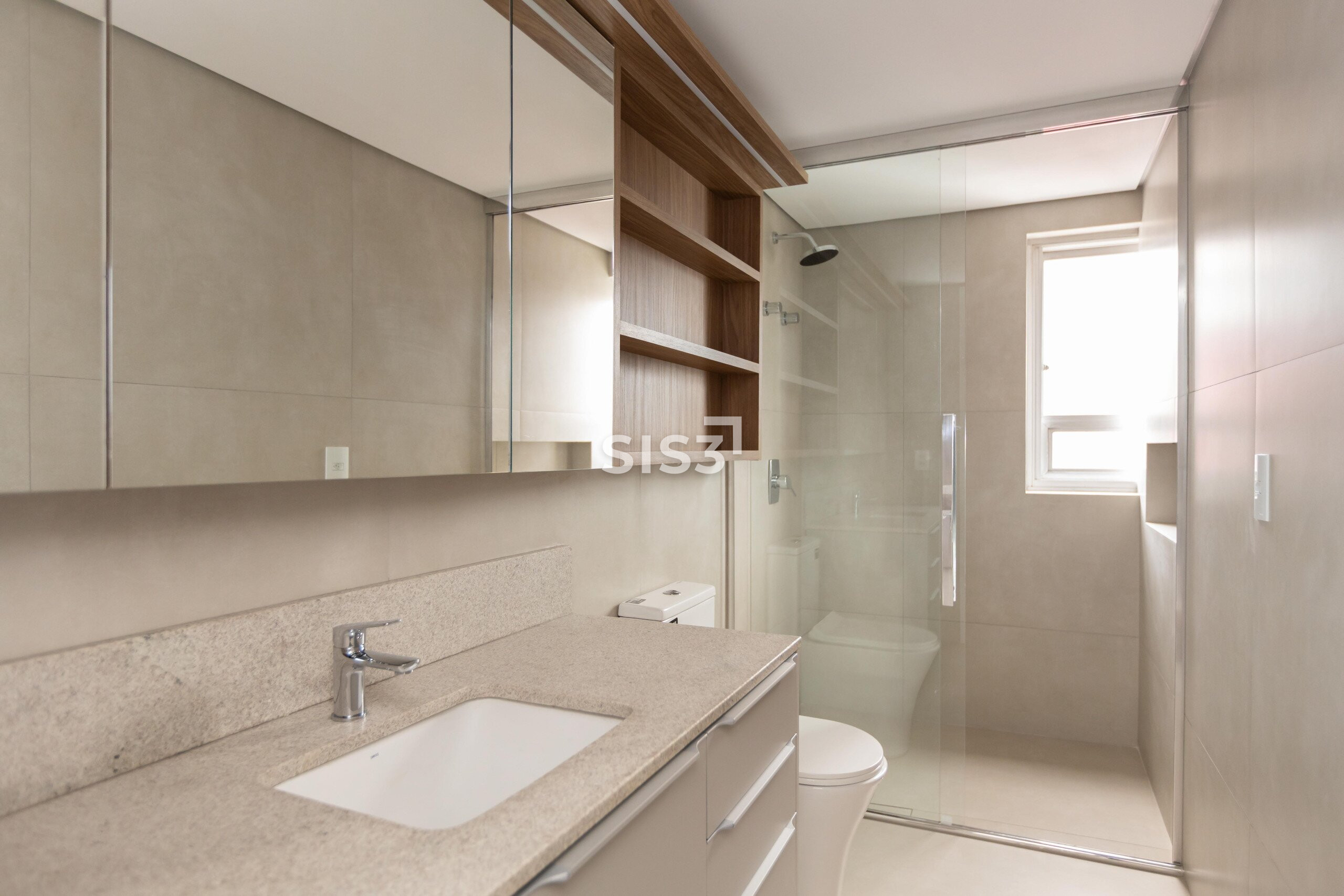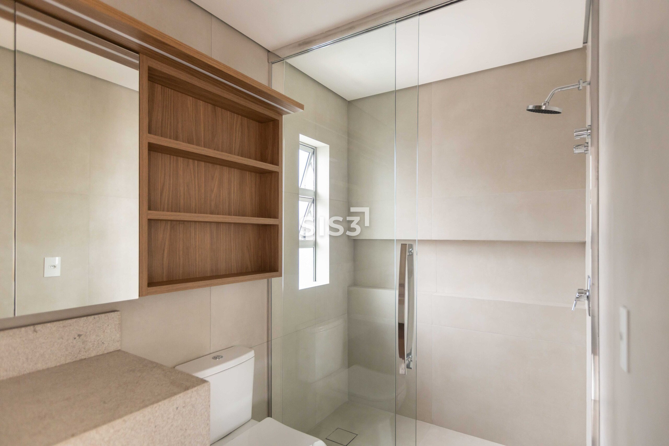 No pavimento inferior, a área social reúne estar, jantar e cozinha em um ambiente contínuo, com grandes aberturas que favorecem a entrada de luz natural e reforçam a sensação de amplitude. A marcenaria sob medida dialoga com os elementos estruturais, trazendo unidade ao espaço. Ainda neste nível estão três suítes, incluindo a suíte master, que conta com closet e marcenaria pronta.